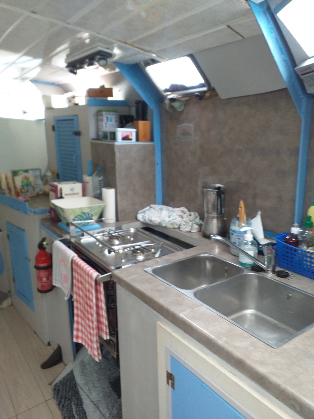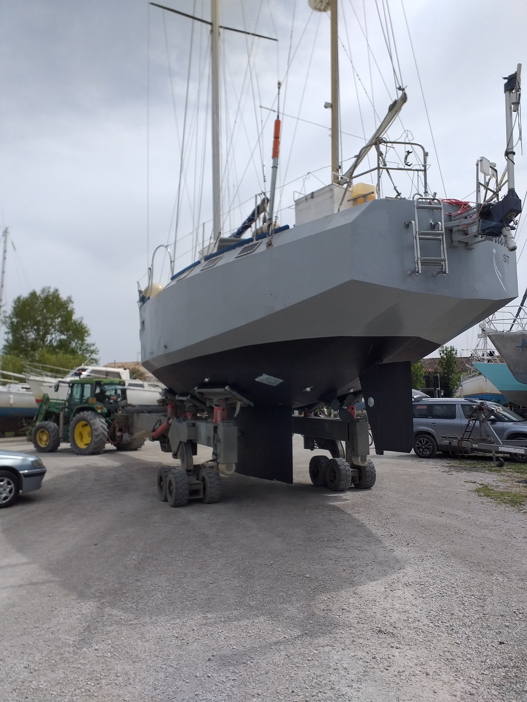 Il s'agit d'une coque acier avec cokpit central et barre à roue ; bateau hauturier, coque à bouchains, très confortable en mer.