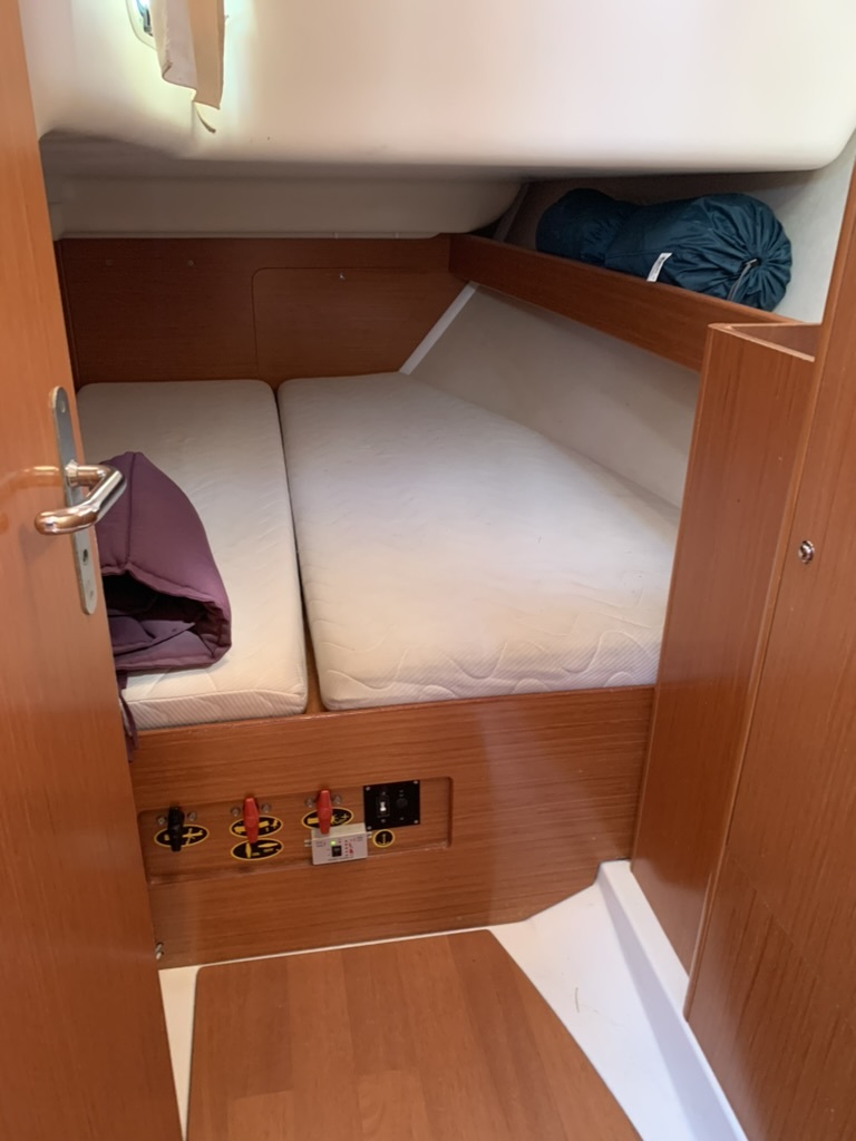 3 Cabines doubles (1 avant/2 arrières ) + Carré pour 8 personnes , 2 salles de bain avec 2 WC marin(dont 1 neuf 2025), douches, eau chaude/froide sous pression, rangement, lavabos.