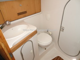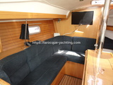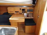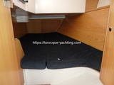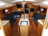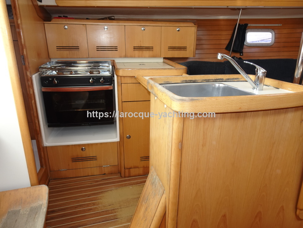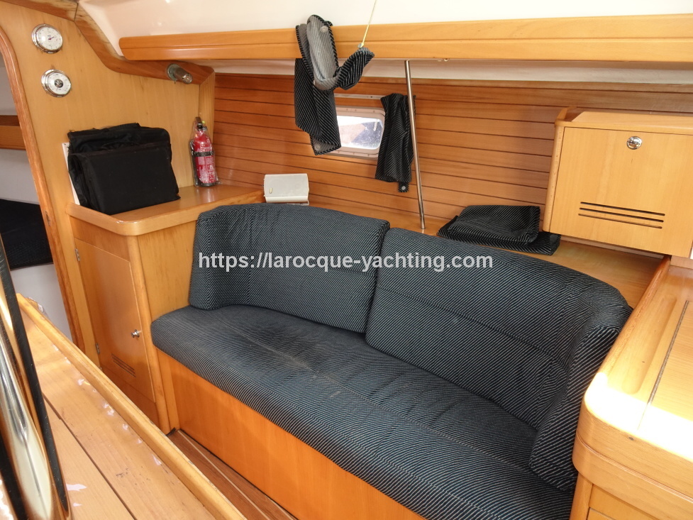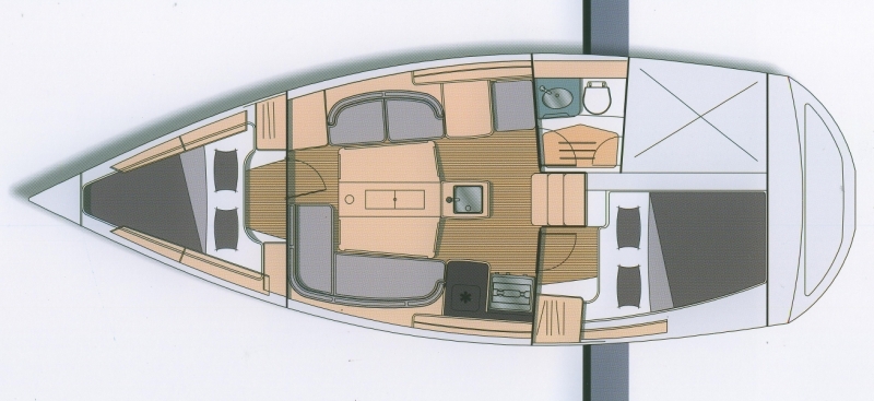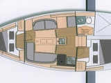 1 Cabine double avant. 1 Carré central avec deux banquettes. 1 Cuisine en L sur bâbord, évier central. 1 Table à carte sur tribord. 1 Cabinet de toilette WC douche lavabo, arrière tribord . 1 Cabine double arrière bâbord.
