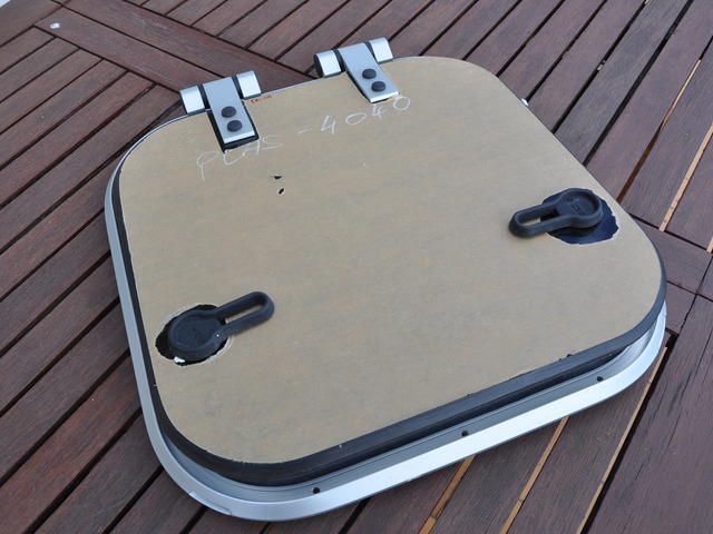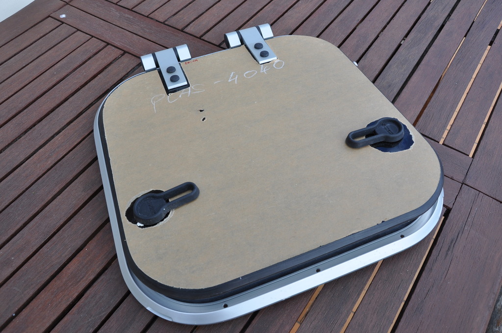 Panneau de pont ouvrant VETUS PLAS - 4040. Aluminium anodisé. 2 poignées. Dimensions hors tout : 424mmx424mm. Couvercle en acrylique fumé de 10mm ( 395mmx395mm ). Charnière à friction. Ouverture n'importe quel angle jusqu'à 180°. Matériel neuf (valeur 320€). Poids:3,100kg.