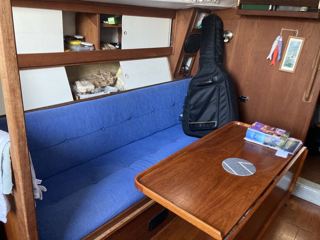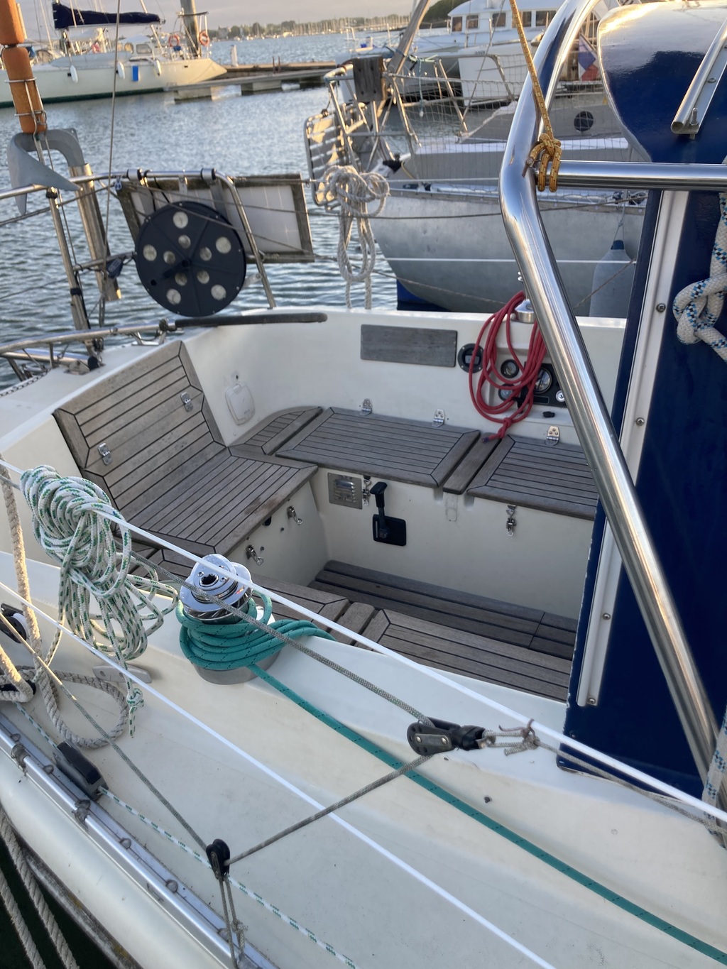 Le voillier Marieholm 33 Fortissimo est similaire au Rustler 36 mais mesure 70 cm de moins. Très bon voiliers qui atteint vite sa vitesse de croisière de 6,7 kn. Voilier équipé avec propulseur d’étrave, windvane et pilote automatique sur barre franche. Nouvelles grande voile et foc de 2020. Genua sur enrouleur. Moteur révisé et tout joints nécessaires changés par professionnel. Nouveau compresseur et évaporateur 2024. Capote en polyester avec vitres en verre dans cadrement en inox. Bateau de 1982 en bon état. Coque et pont ne sont pas repeint donc tout éventuelles défauts ou rides de vieillesse sont visibles. Guindo de sauvetage bon jusqu’à 2028. Annexe et hors bord Honda 2,3 en très bonne état. Interieur: en entrant à bâbord, la petite cuisine et à tribord la table à cartes avec grand frigo dessous. Ensuite le carré avec grande table pliable et 2 couchettes de 2 m long. Après le carré à bâbord le coin toilette avec lavabo et en face un rangement et une penderie. Le triangle est grand avec des armoires autour. Tout le bateau est prévu de beaucoup de rangements pratiques. 4 batteries (moteur, cabine, propulseur) récents de 2 à 3 années.