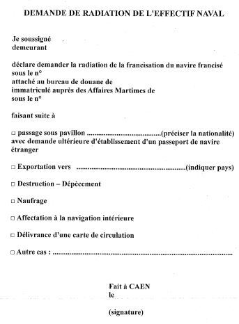 Je viens de demander la radiation du pavillon français suite à la vente de mon voilier. Après un appel au: 02 314 319 45 Affaires Maritimes du Calvados, j'ai reçu ce mail :