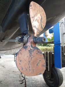 TITIMARIN:Et bien, je ne sais pas. Elle est effectivement plus "rouge" que du bronze neuf mais elle vient de la région de Marseille et je n'ai pas son historique. Elle est particulière car le recouvrement est supérieur à une bipale classique , entre la bipale et la tripale. J'ai voulu cela car avec l'ancienne hélice dés qu'il y avait u peu de mer ou du vent la vitesse s'écroulait dramatiquement. Pour l'instant ca marche, prochaine foi = peinture epoxy et c'est tout.·le 05 sept. 21:36