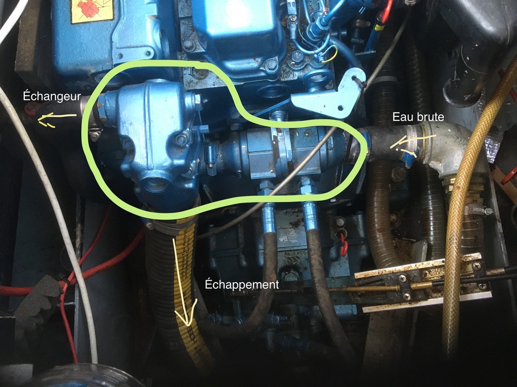 a) quand le moteur fonctionne, il entraîne normalement le rouet de la pompe a eau, l'eau et les gazs circulent et sortent par l'échappement arrière du bateau.