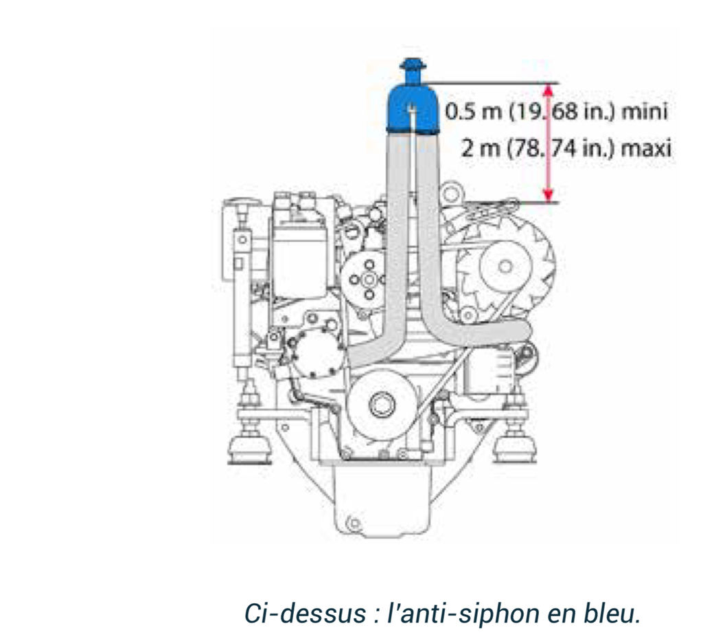 J’envisage de mettre un anti-siphon sur la Nanni Kubota 4.40 d’une pénichette de quelqu’un de ma famille car le moteur se trouve sous la flottaison. Selon les docs constructeur, il est préconisé de le mettre à plus de 50 cm soit au-dessus du haut du moteur, soit au-dessus de la flottaison.