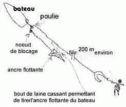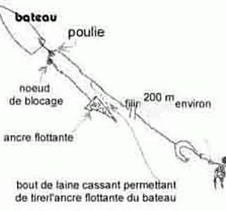 la poulie est attachée sur bout qui lui permet en tension de tomber légérement du bateau et d'entrainer de par là même l'ancre flottante