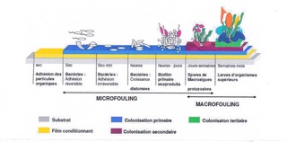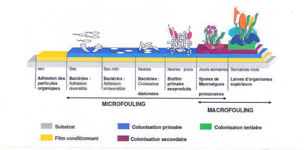 A l'instant ou une plaque de verre est plongée dans l'eau , une colonisation biologique se crée , développant un cycle de développement biologique qui croît très rapidement et par conséquent un envahissement de la surface par le fouling .