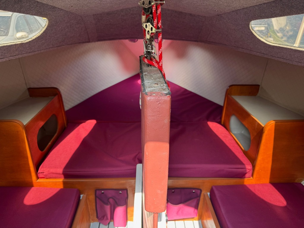 Sur les surfaces "verticales" soit du lambris acajou dans le carré, soit de la moquette, un genre d'aiguilleté très costaud dans les cabines, les deux collés sur la face intérieure des bordés. Ca n'a pas bougé en 43 ans, donc il y a peut-être des idées à prendre ?