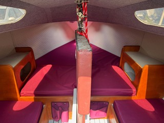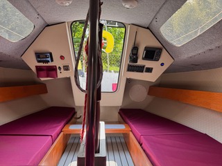 Au plafond soit du CP acajou, soit un matériau qui ressemble à de l'isorel mais plus cartonneux et qui est peint. Les plaques sont vissées directement dans la peau stratifiée inférieure du sandwich du pont. Des couvre-joints acajou, vissés eux aussi, couvrent les jonctions entre les plaques. Le stratifié n'est visible nulle part.