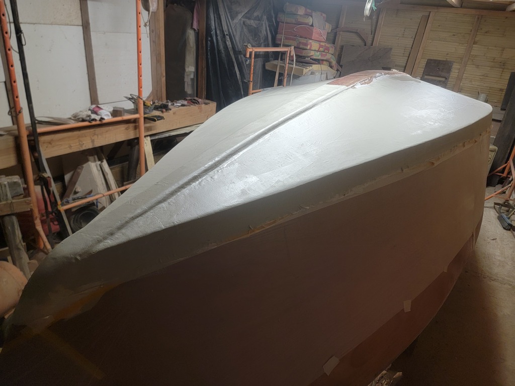 J ai retiré les scotch de mascage. Donc je poserai l antifouling juste avant le retournement du bateau.