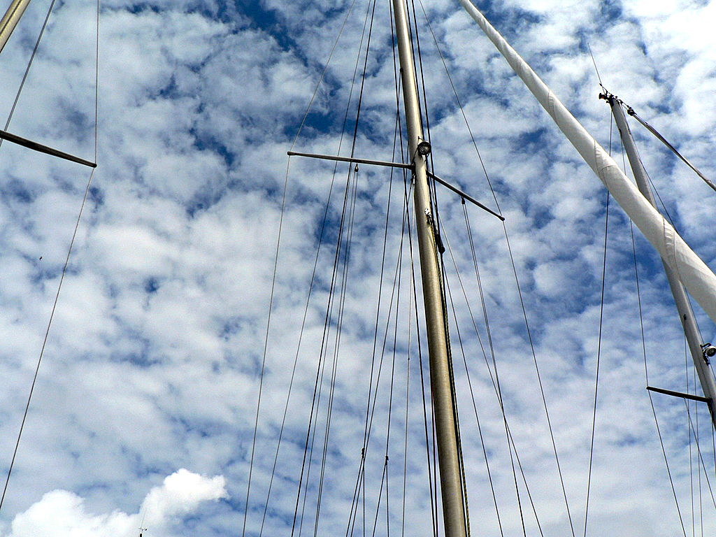 Ce qui m'inquiète, c'est ce hauban absurde qui part du haut du mât et va se fixer en avant des autres. Pourquoi ? Inutile de questionner l'ancien propriétaire, il ouvrira de grands yeux et me dira qu'il l'a eu comme ça. Ca veut-il dire qu'il y a eu une modification fâcheuse de l'existant et qu'on a bricolé ça ? Hypothèse très embêtante. Ou bien (hypothèse moins inquiétante et presque rigolote) qu'on a eu un jeu de haubans d'occasion, ne permettant pas le circuit normal, alors on a fait avec (certains de mes haubans, au dire de connaisseurs, viendraient d'autres bateaux... quel âge ont-ils, personne ne peut être affirmatif).