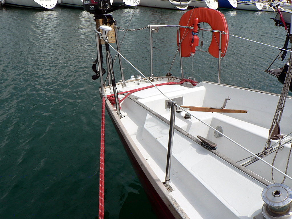 "La traction risquant d'être trop forte pour être supportée par le pont seul, les cadènes des bas-haubans avant sont fixées directement sur les barrots supérieurs de la cloison". Partiellement exact, en fait ils sont repris jusqu'au contre moulage par une pièce inox intermédiaire mais pas sur tout les modèles, sur le mien, mon premier, n°158 1968, il n'y avait pas de reprise de cadènes à l'avant.