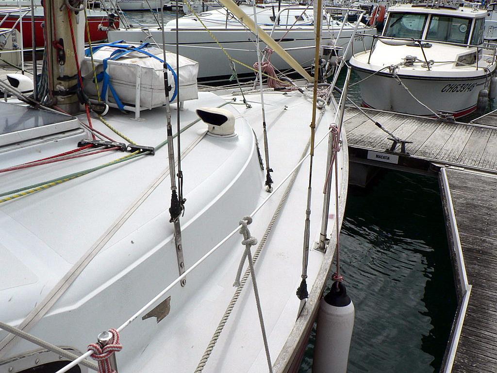 -Deux haubans passant bien sûr par la barre de flèche (Heureusement). L'un de diamètre identique aux bas haubans et aboutissant en tête de mat, l'autre de diamètre légèrement inférieur et aboutissant à mi-distance entre les barres de flèches et la tête de mat. Ces deux haubans aboutissent sur une cadène fixée sur le roof (Les versions intérieures étaient fixées sur le liston). Cette cadène est renforcée à l'intérieur par un ridoir et une tige inox ancrée dans le contre moulage.