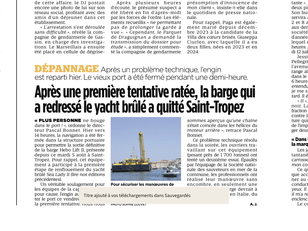 Barge à st Tropez pour évacuer le Yacht brûlé