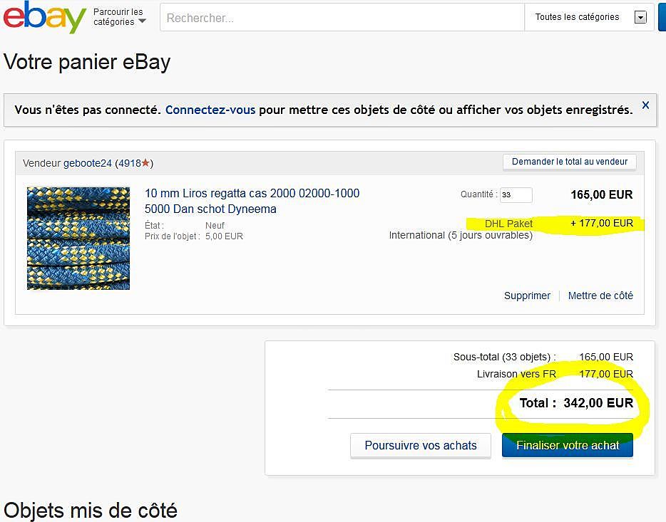 Atttention si vous acheter du dyneema sur eBay acheter un cordage de marque (liros, regatta). Je dis ça par expérience, car j'ai acheté un cordage dyneema sur eBay, et à l'usage la gaine s'est très vite détériorée au niveau des taquets coinceurs, chose qui ne se produisait avec un dyneema de qualité.