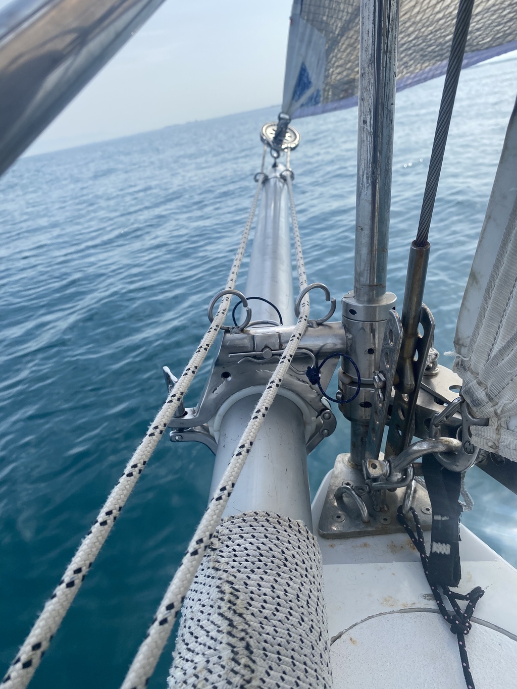 Il aurait mieux valu déjà,comme sur les bomes,de faire un lashing autour du tube du bout dehors, l'effort aurait été mieux réparti.