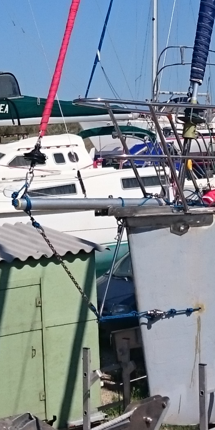 C'est comme pour soulever un moteur avec une petite bome riquiqui,on fait prendre l'effort par la drisse qui passe autour de la bome en lashing et est reprise par dessous sur le palan