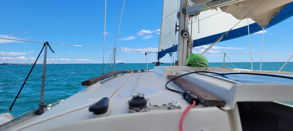 Petit 15 noeuds de Sud, 5,8 noeuds à Bon plein/Petit largue sous génois avec 2 tours dans l'enrouleur.