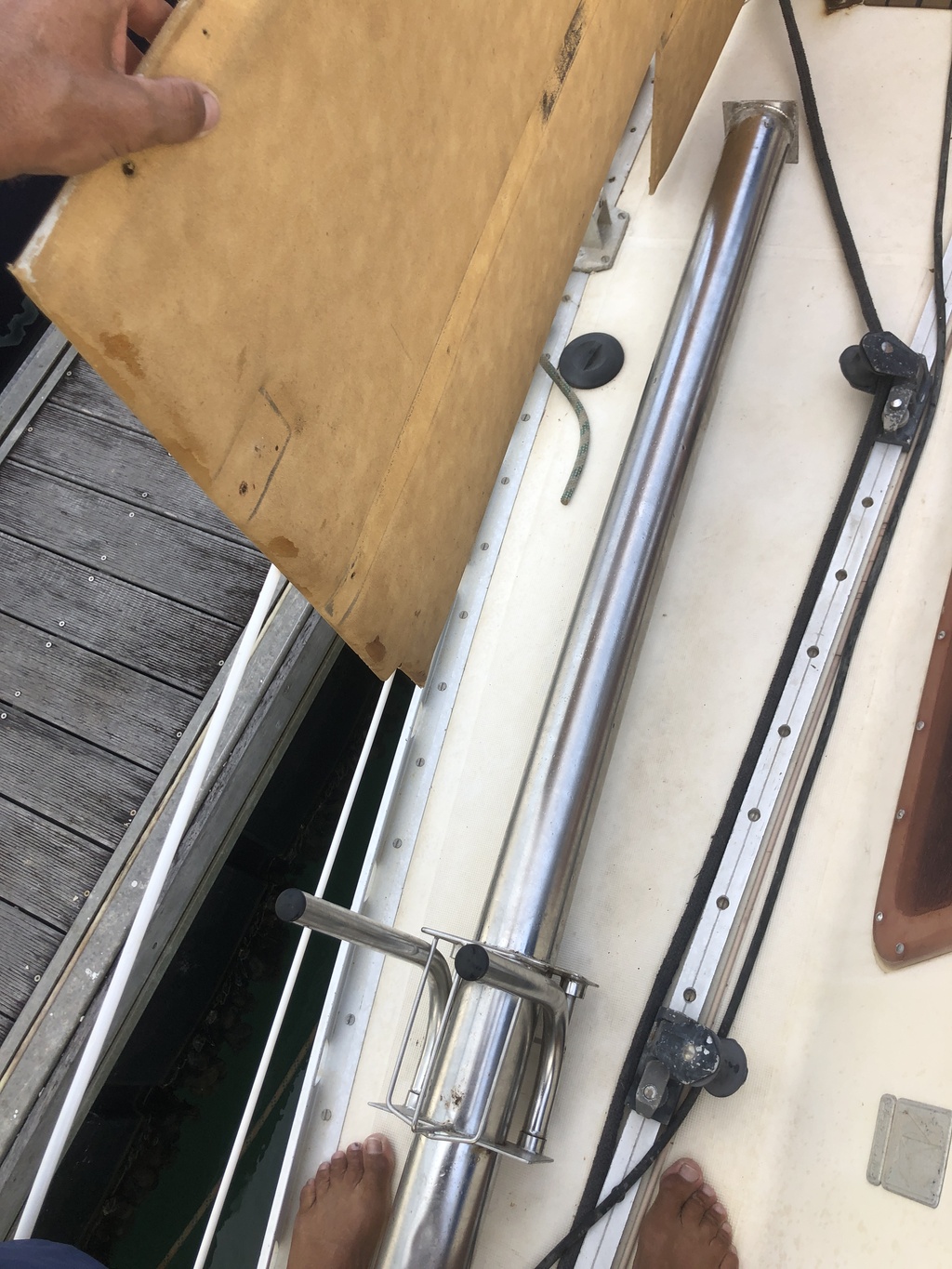 2 vis de main courante alu bâbord qui ne veulent rien savoir empêchant d’enlever le vaigrage bâbord qui, génial! est un seul panneau de 4 m de long! en Cp de 5mil plus mousse plus sky: ingérable la place que ça prend dans le bateau.