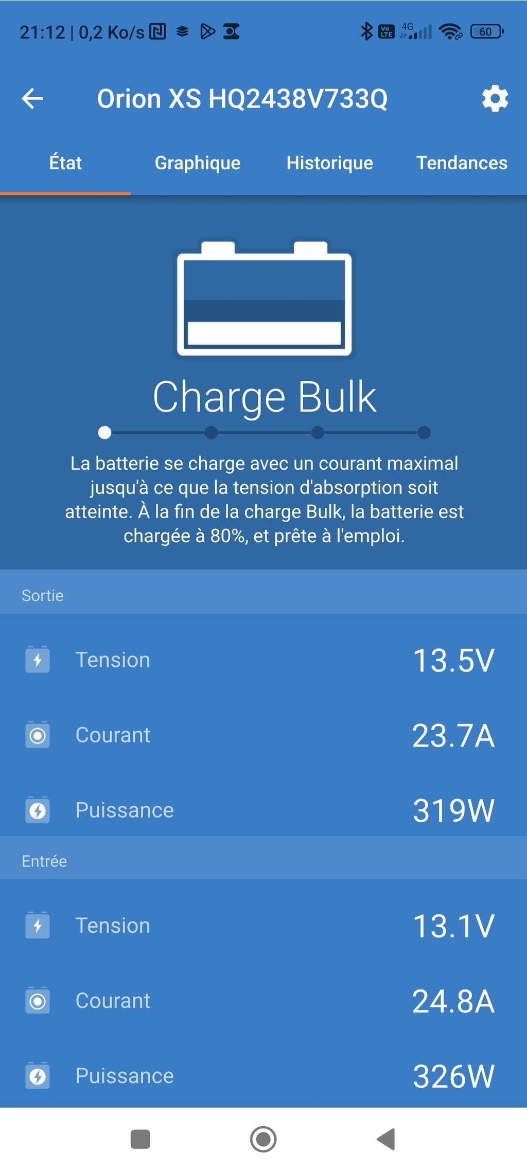 Mon vieux chargeur Cristec assez basique charge à 24A via l'Orion XS.