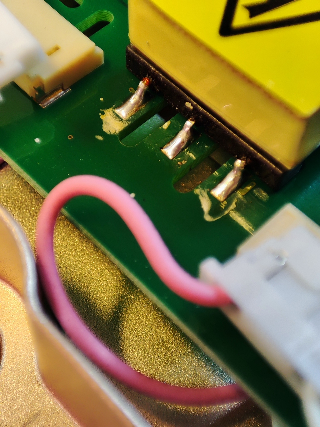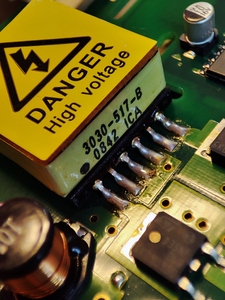 J'ai commencé par le démonter par curiosité et voir s'il n'y avait pas une panne évidente comme une piste coupée, un fusible interne ou un composant explosé. Mais rien de franc. Une des pattes du transfo HT semble avoir chauffé, c'est tout ce que j'ai vu.