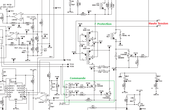 Si ta panne est le rétro-éclairage, tu peux investiguer très prudemment l'étage de commande et de protection du transfo (X2).