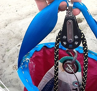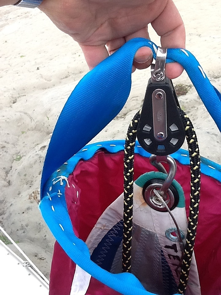 La chaussette vendue avec mon bateau se présente comme ça. Je me demande si elle est bien montée, car je suis étonné de la disproportion entre la manille, très grosse, et la poulie, dont la ferrure est faible par rapport à la manille
