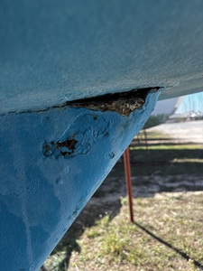 et des fissures au niveau de la jonction quille-coque, visibles notamment à l’avant et à l’arrière.