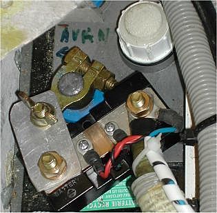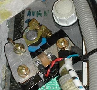 Puisque c'est toi, une photo pour fixer facilement le shunt sur la batterie avec 5 cm de plat en alu de 20x2 mm et 2 boulons laiton de 8 mm, ce qui permet de ne rien modifier aux gros câbles allant au "-" de la batterie.