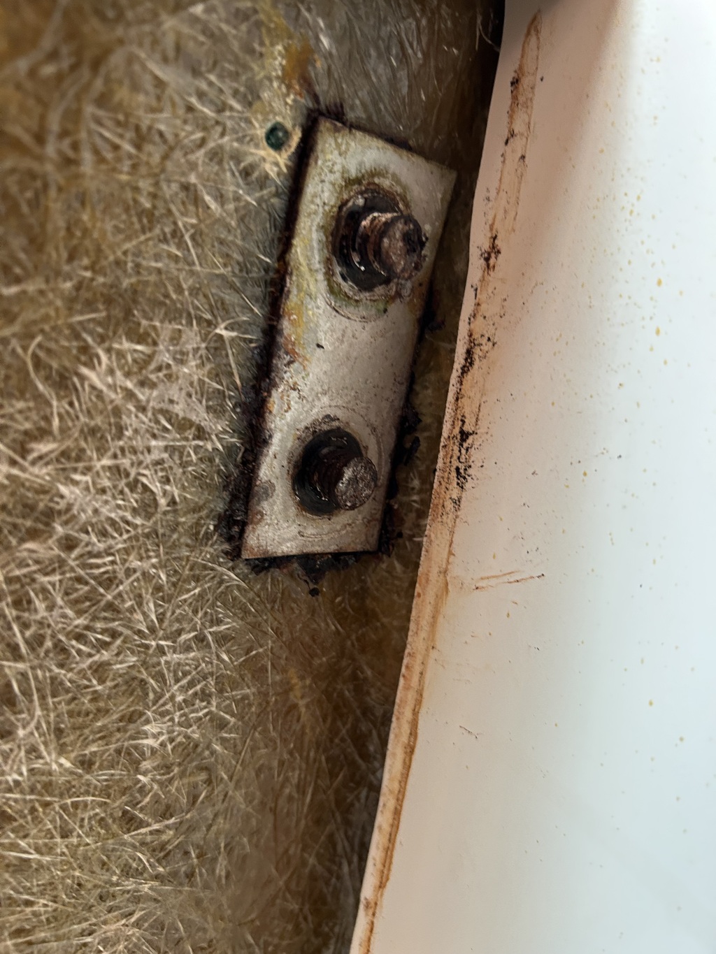 Je pense que la plaque de renfort changée ( en photo) à été changée par un précédent propriétaire qui a souqué sur les boulons. Au fil des mois une petite déformation du pont a favorisé une micro fuite dans le pont et engendré le délaminage constaté autour des cadènes.