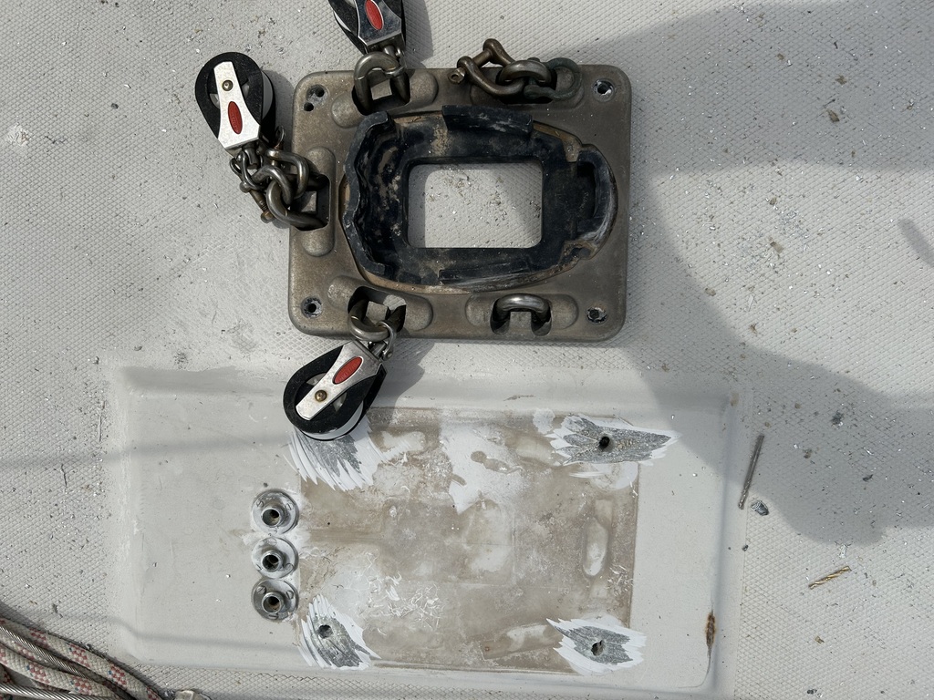 Visserie retiré( la platine est venue avec les tête de boulonnerie cassé avec le mat quand nous avons démâte)retiré du pont en les perçant avec différentes mèches…Un vrai calvaire!