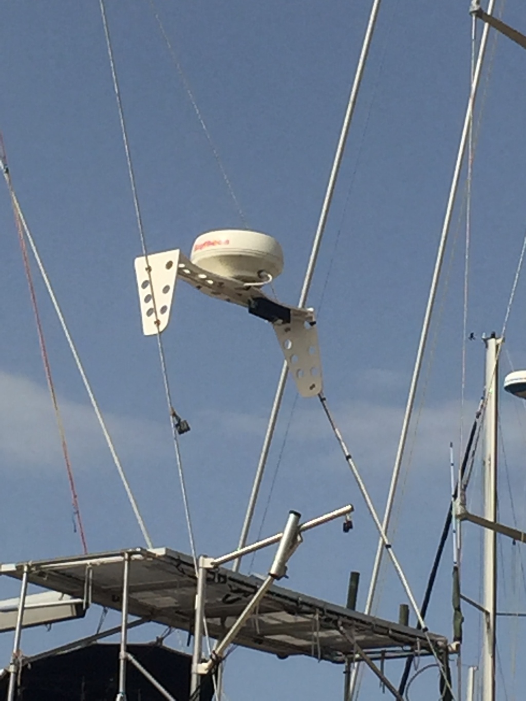 après avoir eu un radar que j' avais installé sur mon Armagnac juste au-dessus des bdf, donc à environ 6m au-dessus de la flottaison, j' ai installé le radôme de mon bateau actuel sur un mâtereau télescopique sur le portique, soit à un peu moins de 4m par rapport à l' eau.