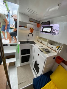 Dans la cuisine, outre le réchaud, il y a des boites seulement retenues par des fargues, le moindre coup de gite ...