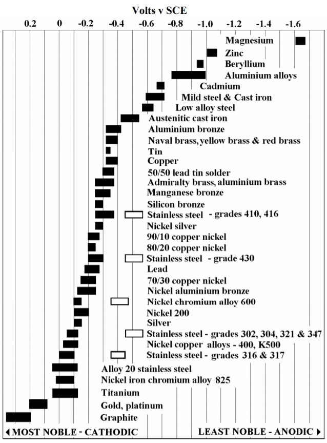 Je vous soumets un tableau sur la corrosion galvanique qui précise les risques plus ou moins élevés dans la cohabitation.