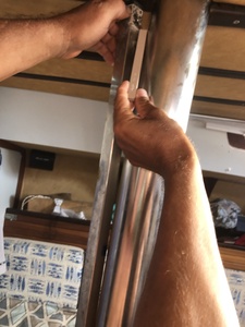 Certains me disent que je peux continuer à naviguer comme ça qu’elle est tordue depuis un bon moment. Mais c’est pas beau à voir même si pas de fissures ni déformation bosses ou autres. Le pied de mât a l’air intégré contrairement à 3/4 Mélody que j’ai visité ici en Martinique.