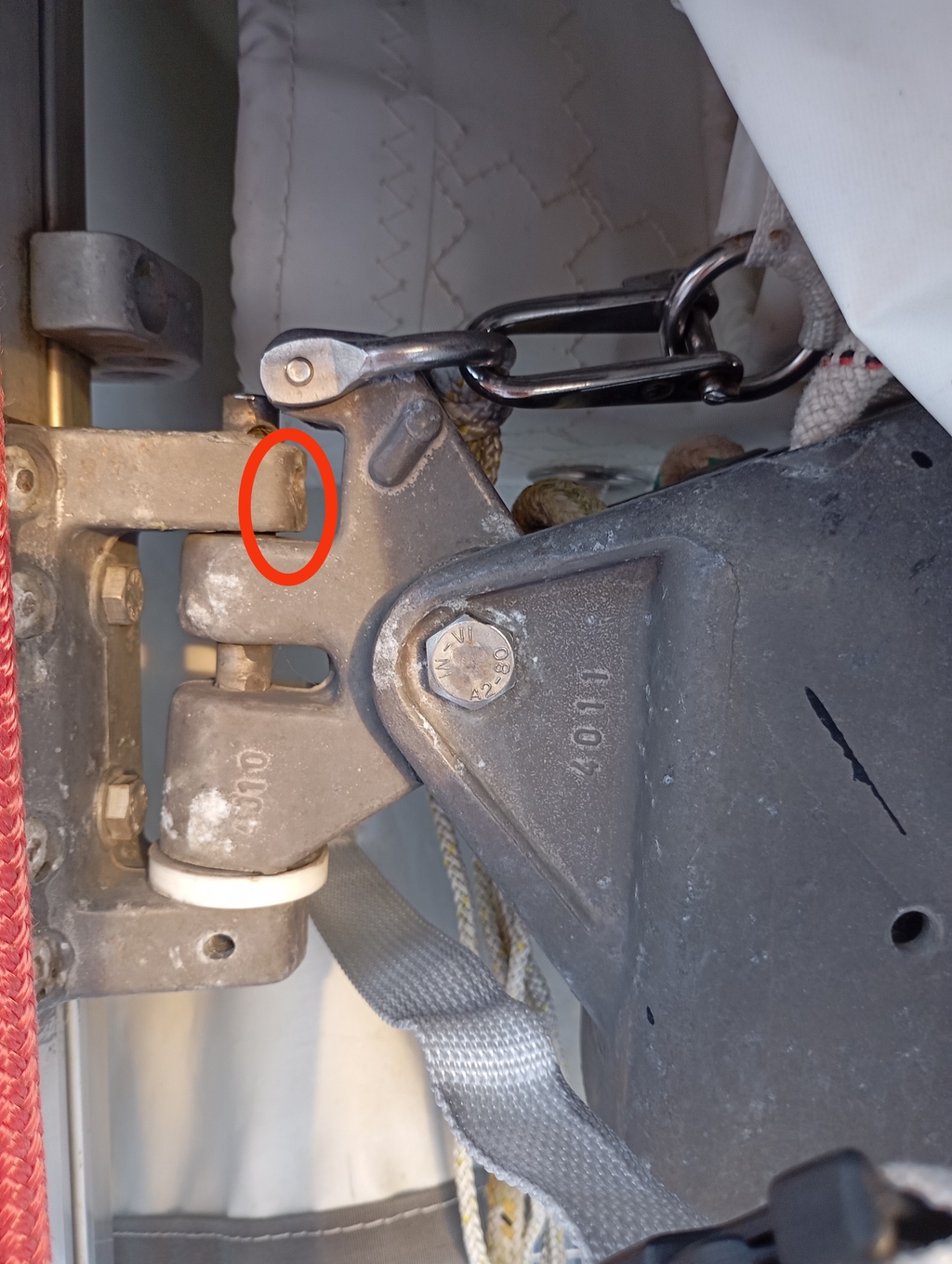 Ohako:L'axe vertical semble être sorti du palier inférieur !Je pense que le trou de l'axe devait être aligné avec le trou indiqué . En tournant la bome vers le haubant il doit être possible de voir si le trou est fileté pour mettre une vis.·le 31 mai 06:10