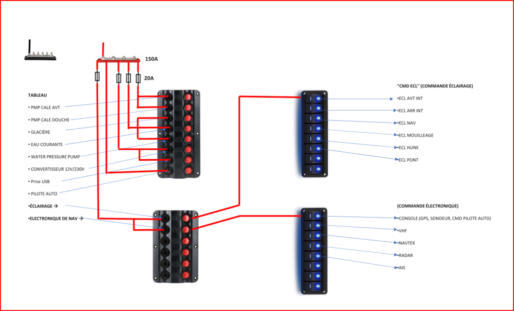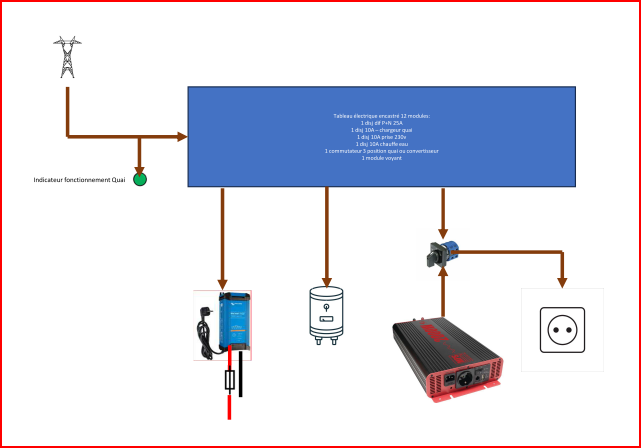 Je conseille aussi de ne plus utiliser d'ampoules à filament (feux de nav. et éclairage intérieur) et de les remplacer par des LED. Donc il faudra adapter les disjoncteurs au nouvel ampérage des consommateurs qui sera plus faible.