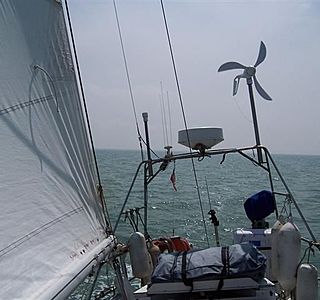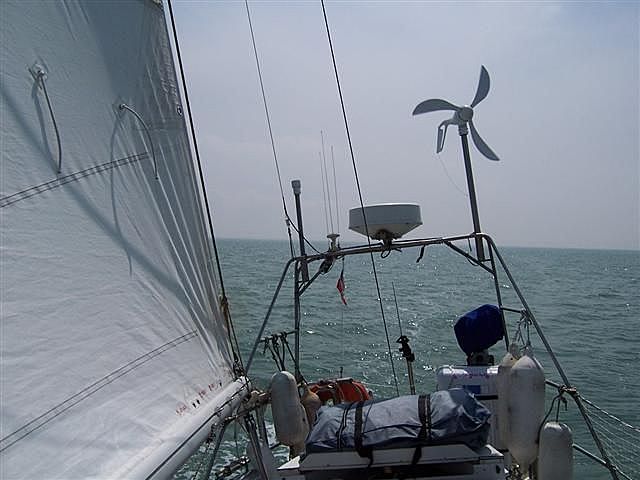 Le gros tube est fixé au bateau, le tube plus mince supporte l'éolienne. Chaque tube fait environ 2,8 m le tube de plus petit diamètre dépassant vers le haut.