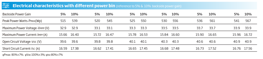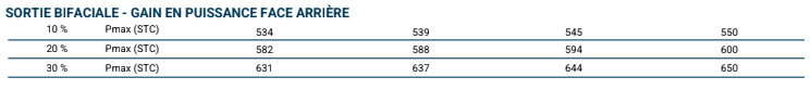 Je comprends un peu mieux la signification des données de puissance de la partie inférieure indiquées dans les fiches techniques comme par exemple en images jointes. J'imaginais que la face arrière était théoriquement capable de produire la même puissance que la face avant et que les puissances indiquées représentaient le gain attendu lorsque la face arrière est exposée à 5, 10, 20 ou 30% de la puissance lumineuse que reçoit la face avant.