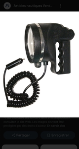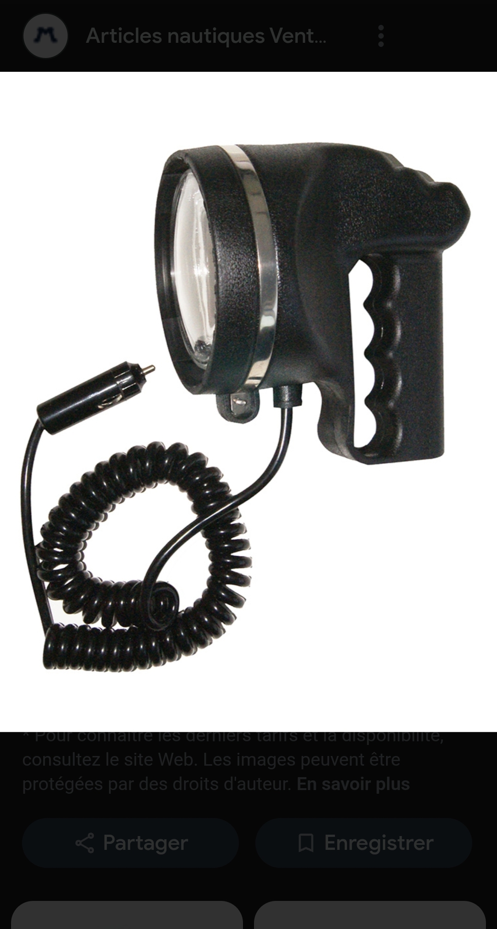 J'utilise un phare longue portée de polo que j'ai installé dans le boitier d'une lampe HS. C'est un faisceau large, avec une portée satisfaisante avec une ampoule de 100 watts. Il y a un cordon spirale avec une prise allume-cigare. Je ne l'utilise pratiquement jamais, uniquement en cas d'extrême nécessité, pour ne pas éblouir les bateaux alentour ou moi-même. Je préfère laisser mes yeux s'accoutumer à l'obscurité, sans lumière parasite. Je peste quand bateau à proximité en braque une sur moi, détruisant ma vision pour de longues minutes.