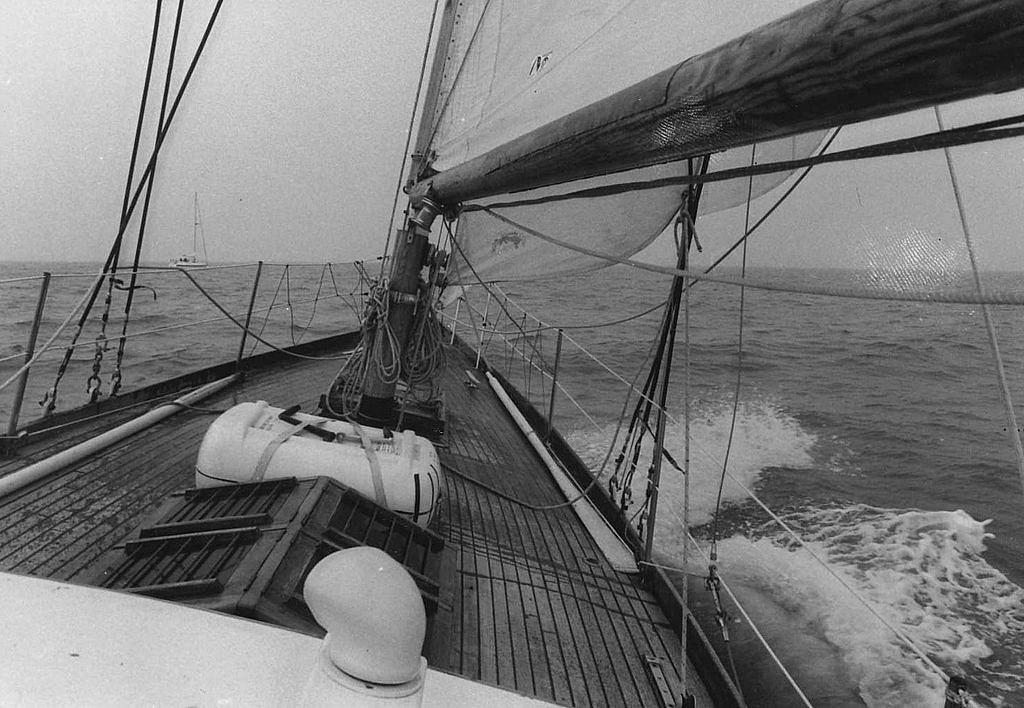 Le dériveur intégral était un très beau bateau, équipé pour les glaces(alu épais, compartiments étanches...)donc très lourd, et sûrement quelque peu sous toilé, tout comme mon cata...et son capitaine commençait à être fatigué, après + de 10 ans à bourlinguer avec en solo...