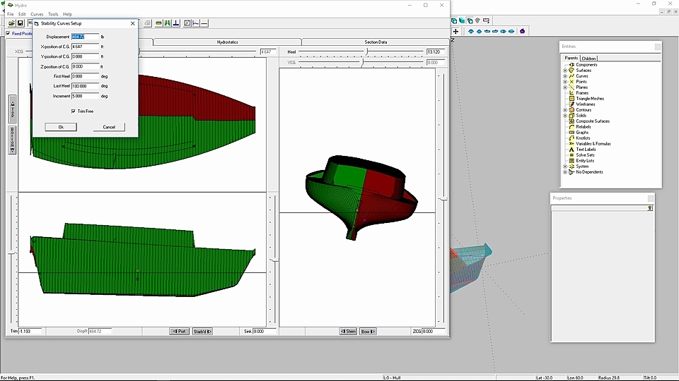 puis pour des si petit bateau..ça se faire a la "main , avec courbe Bonjean , calcul du cdc suivant inclinaison et calcul de l'inertie de surface ...