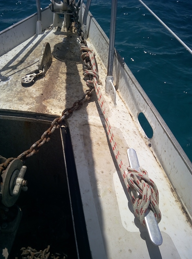@ Pytheas54 : quand tu as un mouillage "tout chaine", 1 amarre partant de chaque taquet et 2 nœuds de bosse sur la chaine; ça fait patte d'oie (donc bras de levier pour limiter l'évitage), ça répartit les efforts sur les 2 taquets; rien ne rague sur le davier ou sur le pont puisque tout est en dehors du bateau;