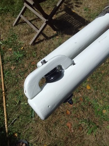 Modification de mon gui. Ça avance. L'extrémité côté violons attend sa seconde couche de peinture blanche. Celle côté encornat est dans l'état dans lequel je viens juste de la laisser : tout est fixé définitivement (encornat, taquets, crochet d'oeillet de ris a travers duquel passe l'armure en tresse bituminée) et attend la première couche de peinture blanche.