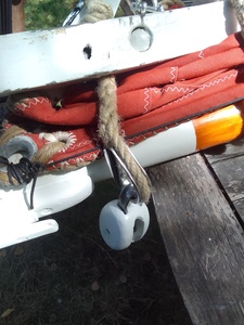 Bon les travaux sont plus ou moins terminés. Aujourd'hui j'ai finalisé le point bas du palan de hale bas de bôme, effectué quelques retouches de peinture et regréé la GV (les nouvelles bosses de ris : RAS).