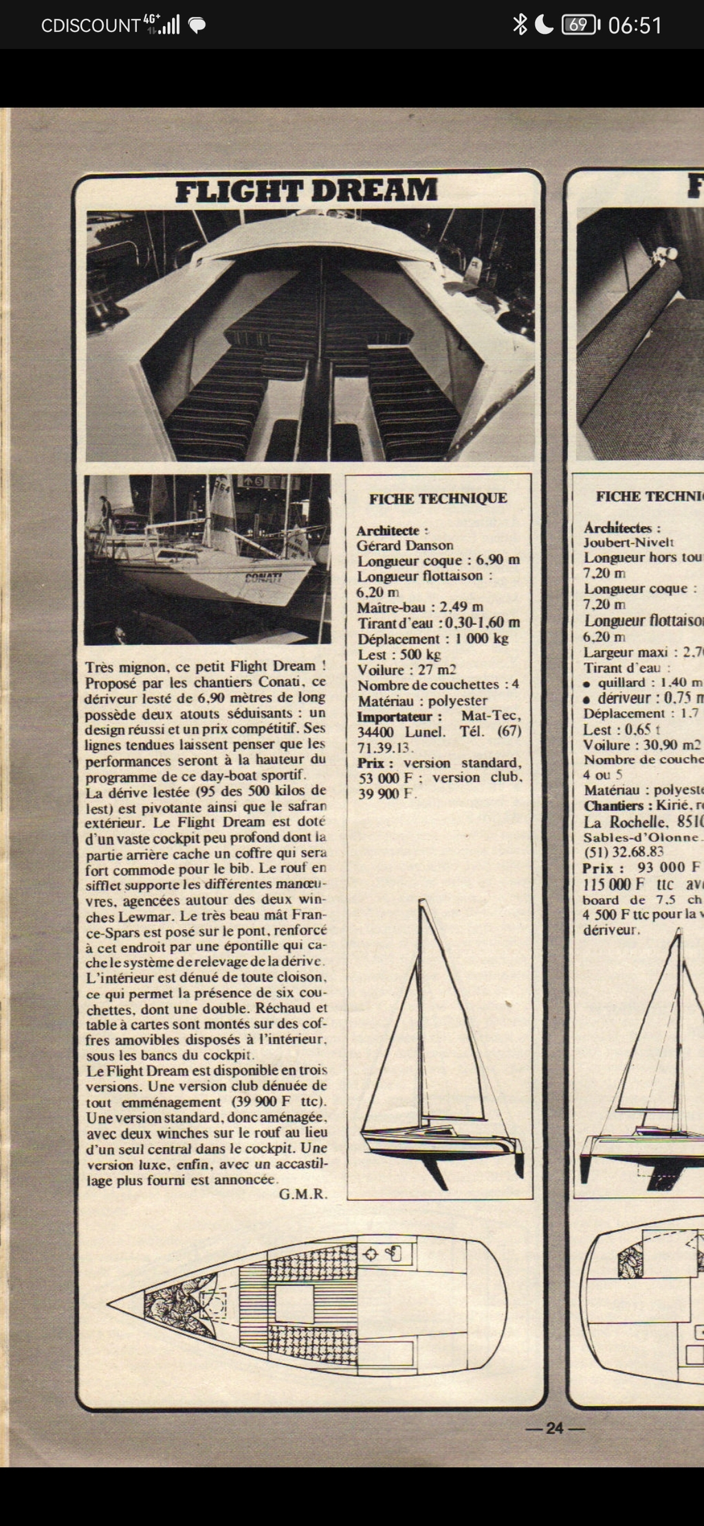 Un Conati 22 fly dream, ancien mais avec un gros rating FFVoile. Dériveur intégral moins de 7m avec un mat de 11m paraît-il... Un partage sur hisse-et-oh existe. Sûrement une perle rare