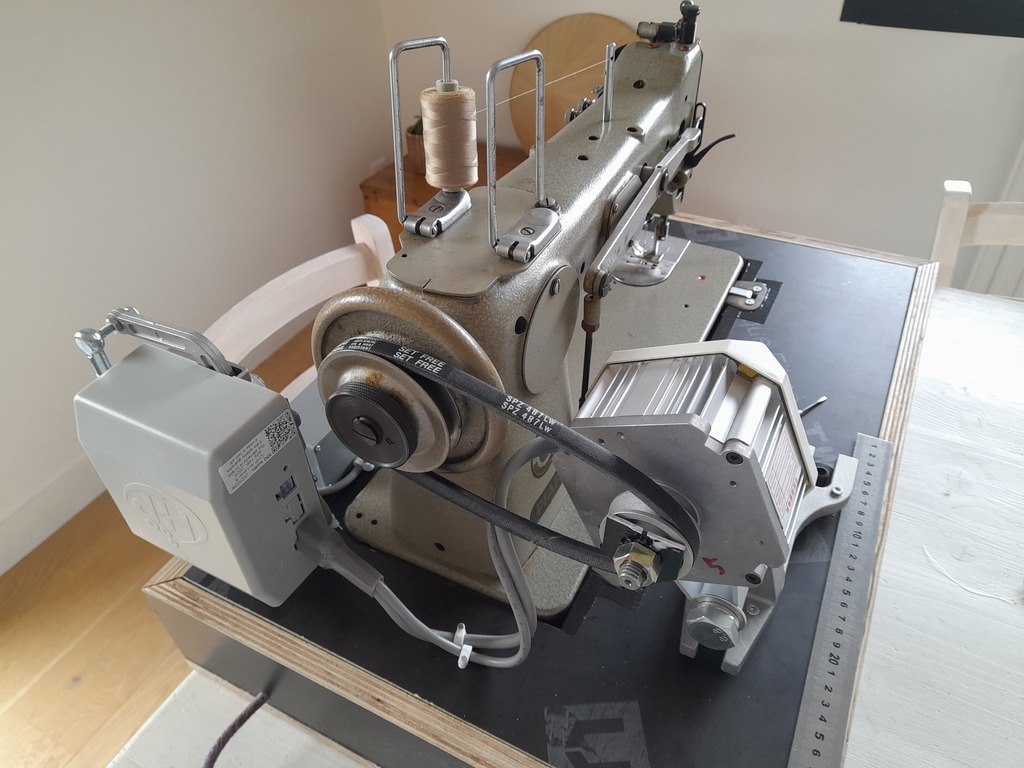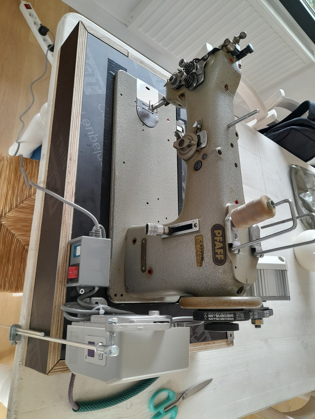 Je viens de terminer l'installation de ma pfaff 138 sur caisse en bois transportable et servo moteur.