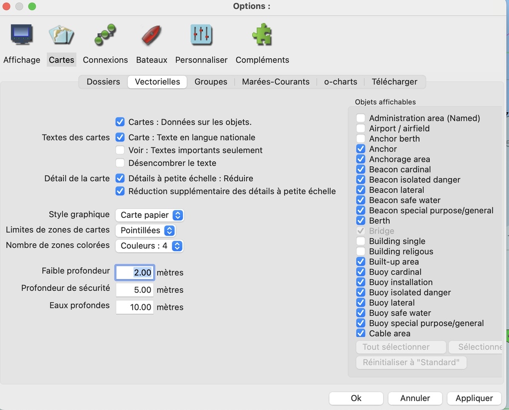 Second point: dans l'onglet "cartes vectorielles" "objets affichables" je n'ai pas accès au choix du bas "tout, rien, standard" même en activant par les trois traits en bas à droite "cartes: affichage"