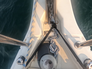 Mon canot est un Sun Odyssey 410. La delphinière est longue et m'empêche d'avoir accès à la chaîne depuis l'avant du bateau. Le passage dans le davier est trop étroit pour y glisser une main de fer. J'utilise donc un noeud d'alouette pour soulager le guindeau. J'en suis très content car ça s'installe simplement, rapidement et ça s'enlève tout aussi rapidement. Jusque là, ça n'a jamais fait défaut mais on n'a jamais pris plus de 25 noeuds au mouillage.Est-ce que certains d'entre vous utilisent le même système? Est-ce que ça tient par vent fort? Je me dis que je doublerais ou triplerais les tours autour de la chaîne (noeud de Prussik?) si nécessaire.