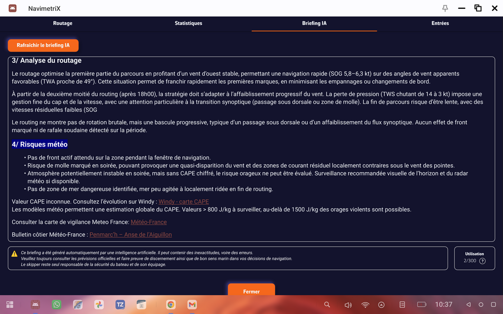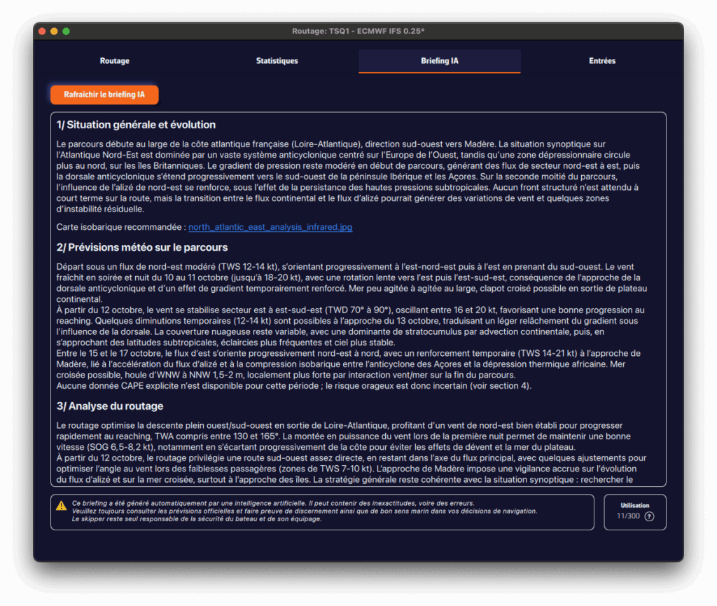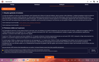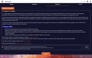 l'analyse IA rassemble les données météo disponibles plus les décisions de calcul de routage pour donner une synthèse. Il faut être connecté au réseau internet.